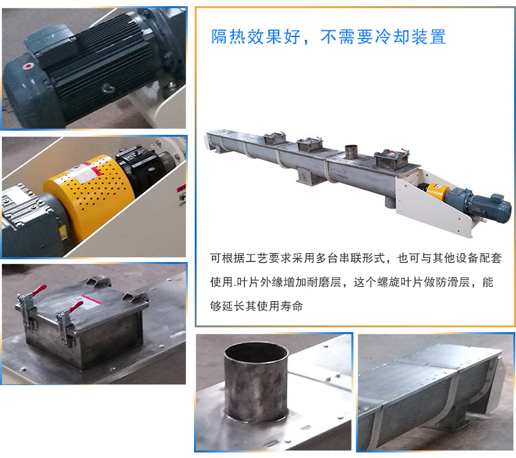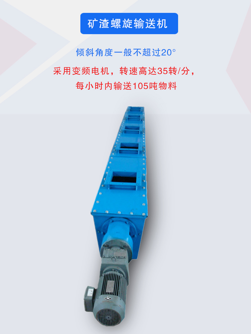 礦渣螺旋輸送機(jī)是由驅(qū)動(dòng)裝置、螺旋、頭部軸承、尾部軸承、懸掛軸承、機(jī)蓋、底座等組成。驅(qū)動(dòng)裝置:由電動(dòng)機(jī)、減速器、聯(lián)軸器等組成。螺旋軸與吊軸承、頭部軸承、尾部軸承聯(lián)接采用嵌入舌式,安裝拆卸不需軸向移動(dòng),維修方便,采用變徑結(jié)構(gòu),增大吊軸承處的容積,避免吊軸承與物料接觸,各傳動(dòng)部位采用浮動(dòng)聯(lián)接方式,頭尾軸承座均在殼體外,所有軸承采用多層密封和配合密封技術(shù),軸承使用壽命長(zhǎng)。