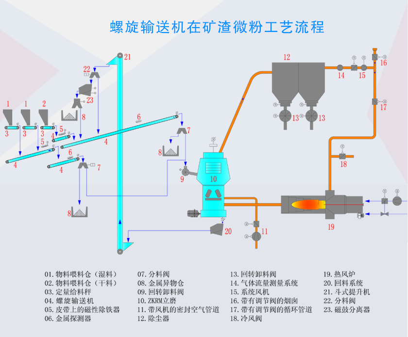 烘干后的磨渣進(jìn)入磨機(jī)進(jìn)行粉磨,粉磨出來(lái)的渣粉經(jīng)過(guò)選粉機(jī)進(jìn)行篩選后,與磨機(jī)渣粉由螺旋輸送機(jī)送回磨機(jī)繼續(xù)粉磨,與磨機(jī)形成閉路循環(huán),合格的渣粉有螺旋輸送機(jī)送至成品倉(cāng)。