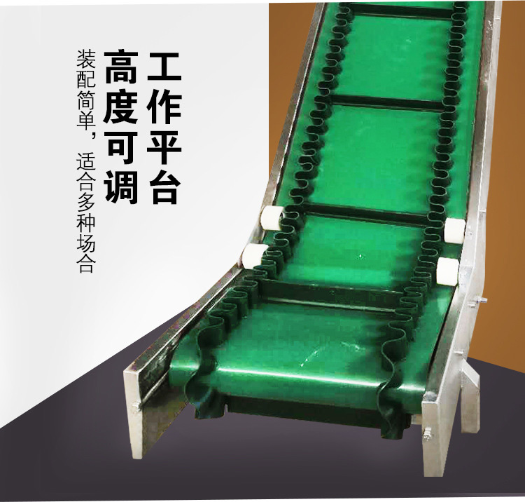 裙邊皮帶輸送機又叫波紋擋邊皮帶輸送機,在平形橡膠運輸帶兩側粘上可自由伸縮的橡膠波形立式“裙邊”,擋邊起可防止物料測滑撒落的作用