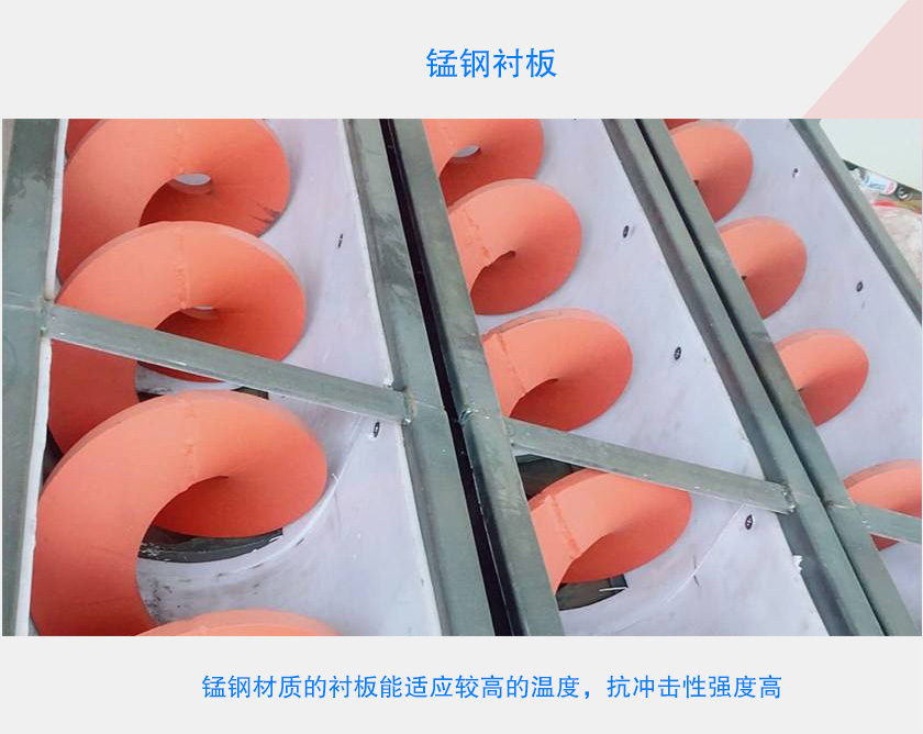 錳鋼材質的襯板能適應較高的溫度,抗沖擊性強度高,耐腐蝕性好,比較適合耐磨性大的物料。雖說錳鋼成本相比其他兩種來說更高一些,但實用性也相對較高。